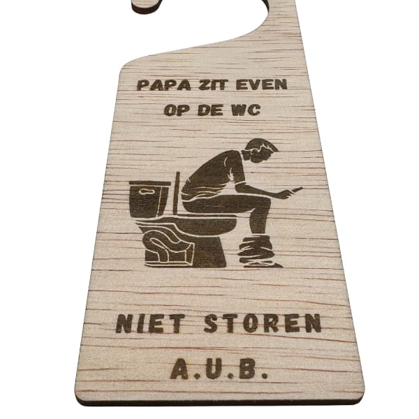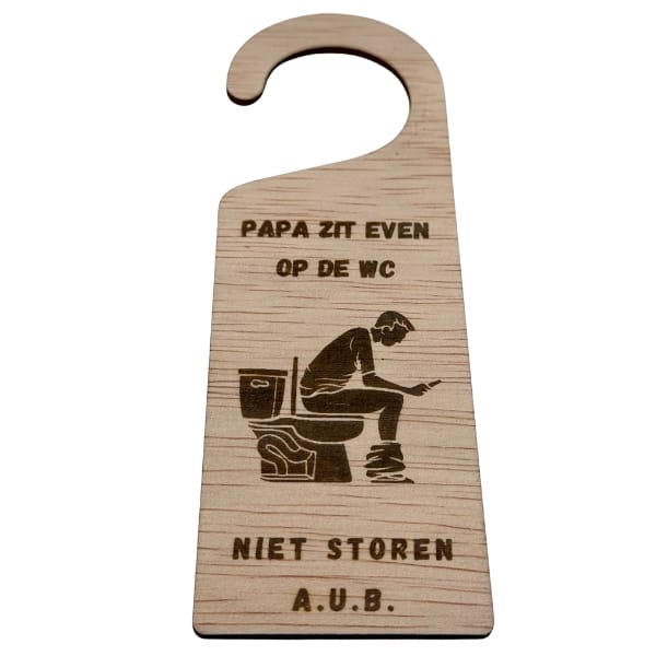 Iedereen weet het, maar niemand zegt het hardop. Tot nu. Met deze houten deurhanger ‘papa zit heel even op de wc’ hoeft papa zichzelf niet meer te verklaren. Hang hem aan de deur en klaar.