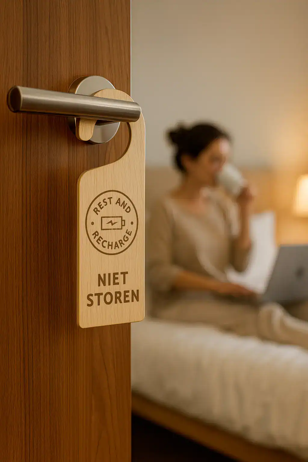 Iedereen verdient een moment om bij te komen. Met deze houten deurhanger ‘Rest and Recharge’ geef je jezelf officieel toestemming om die rust te nemen — en laat je anderen weten dat ze even moeten wachten.