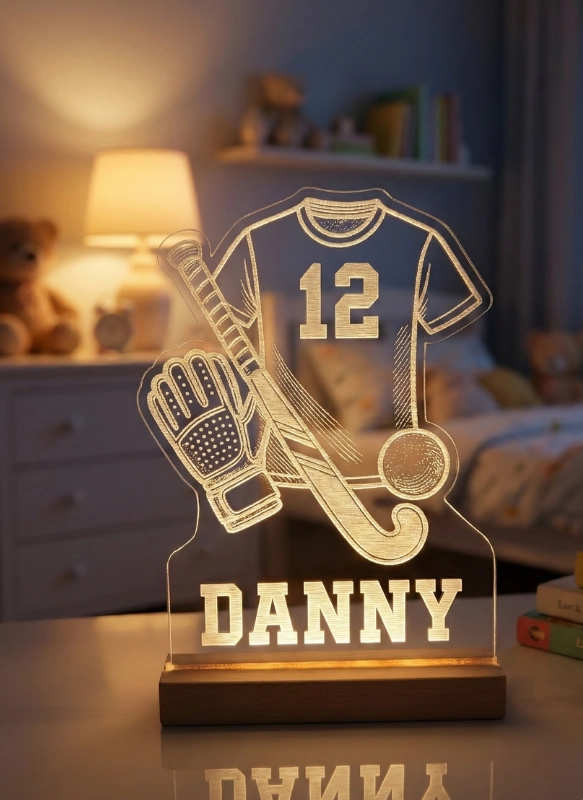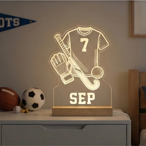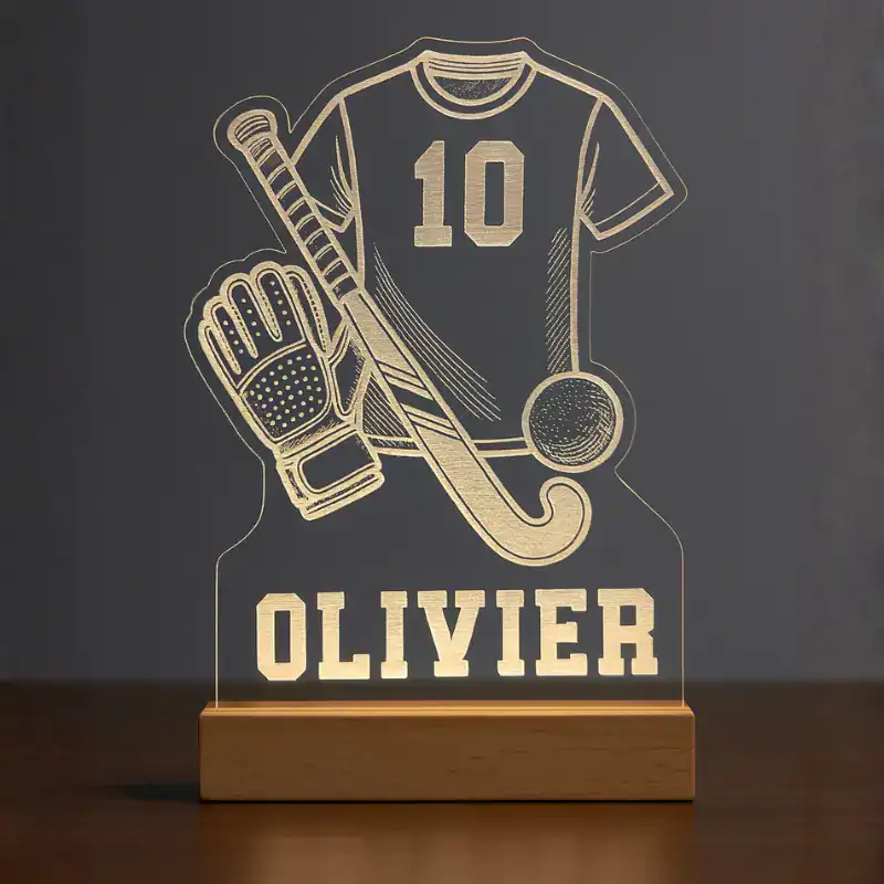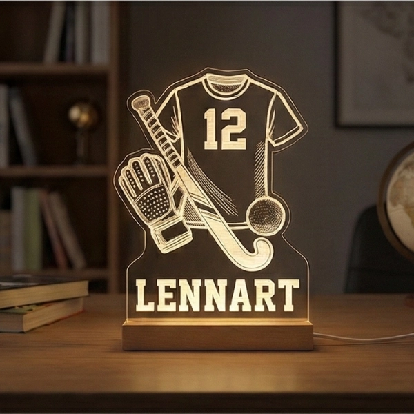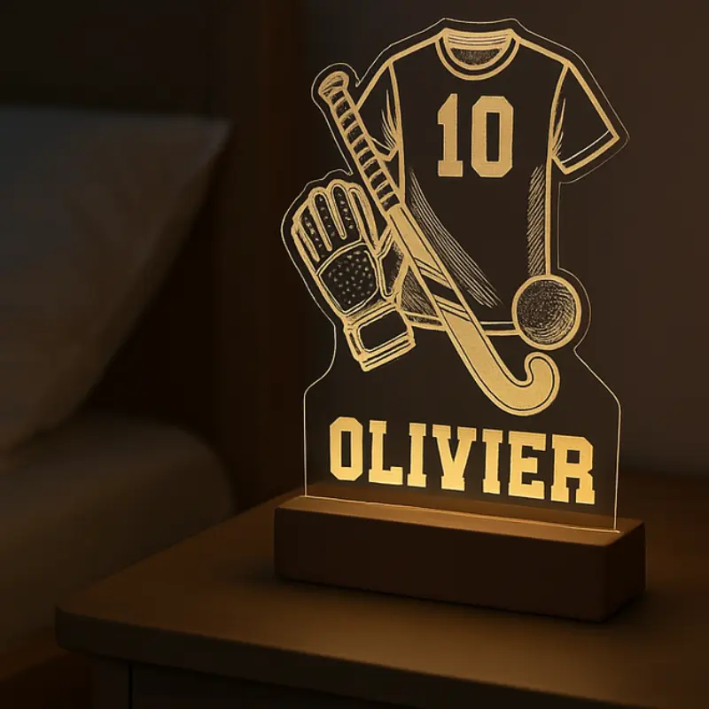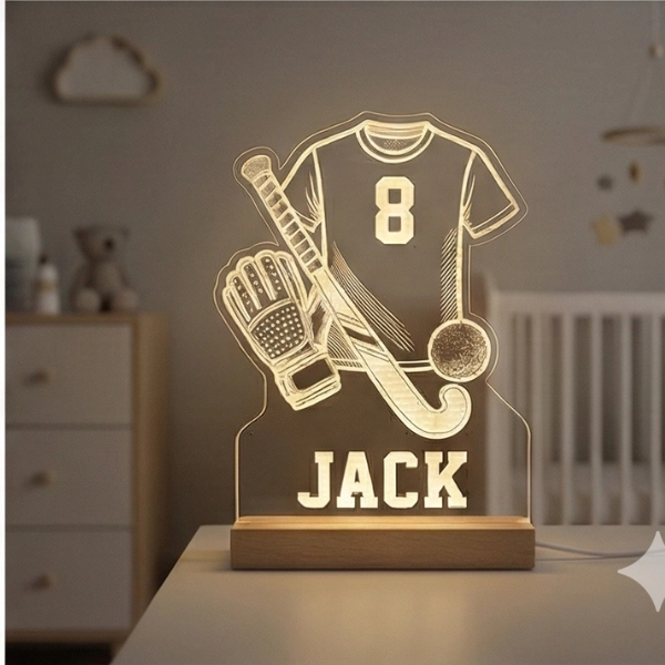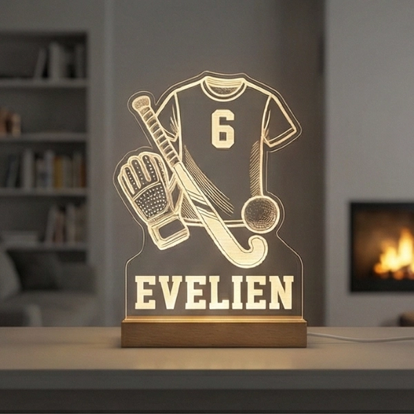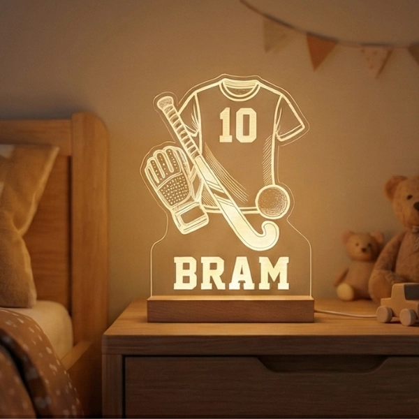 Een gepersonaliseerd hockey nachtlampje met eigen naam en rugnummer — sfeervol cadeau voor de kleine hockeyster.