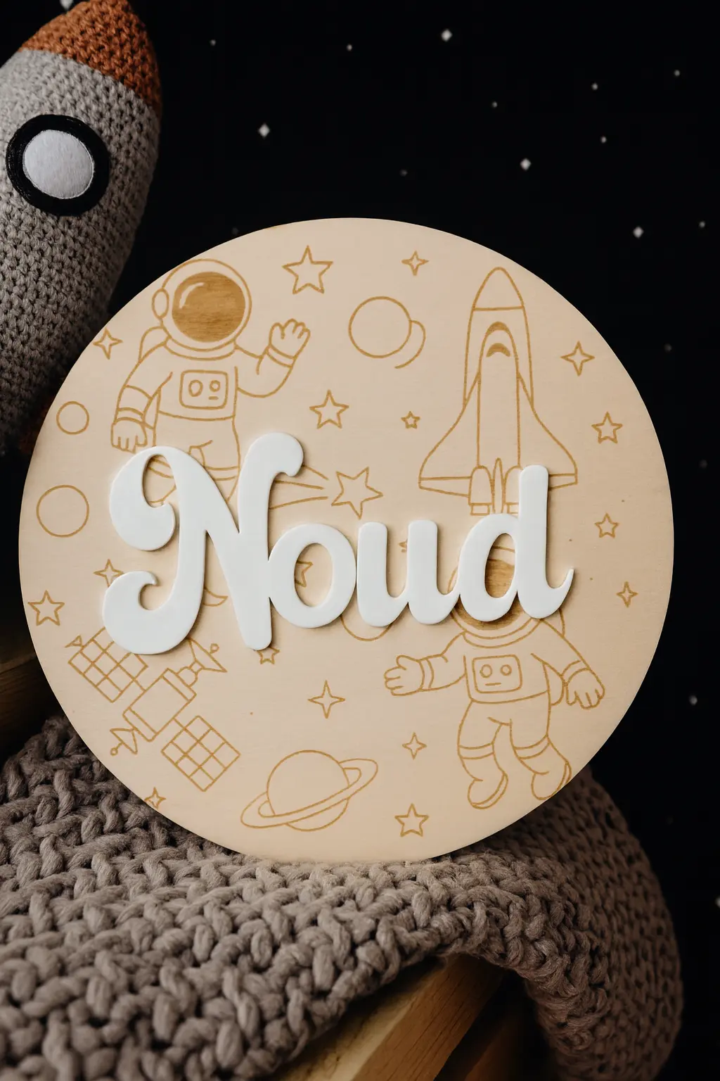 Houten naambordje voor de kinderkamer met astronauten in de ruimte