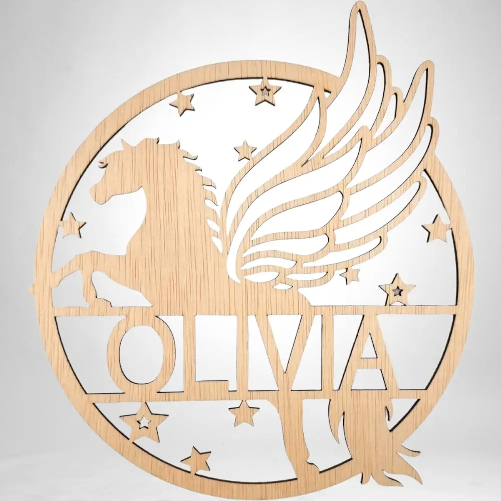 De kinderkamer of babykamer maak je helemaal af met dit naambordje waarin de afbeelding van Pegasus, het gevleugelde paard, is verwerkt. Deze naambordjes zijn zowel voor de jongens- als ook meisjeskamer een waardevolle aanvulling.